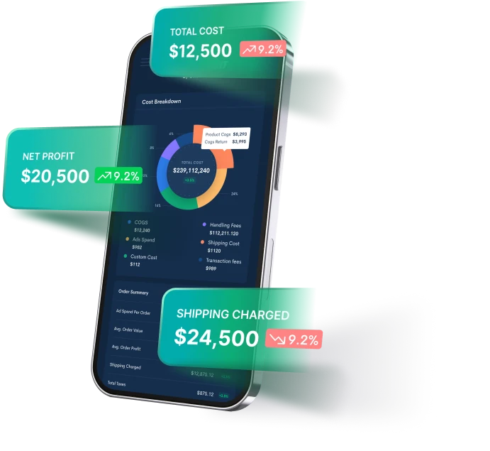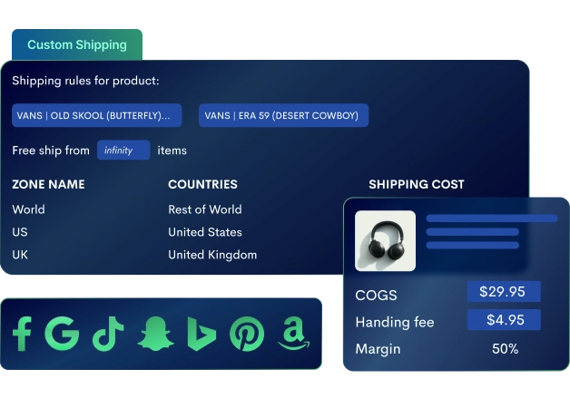 Track COGS, synchronize ad spends, transaction fees, taxes, and any custom costs. You can even synchronize and set up shipping costs based on product, location, quantity, or weight.