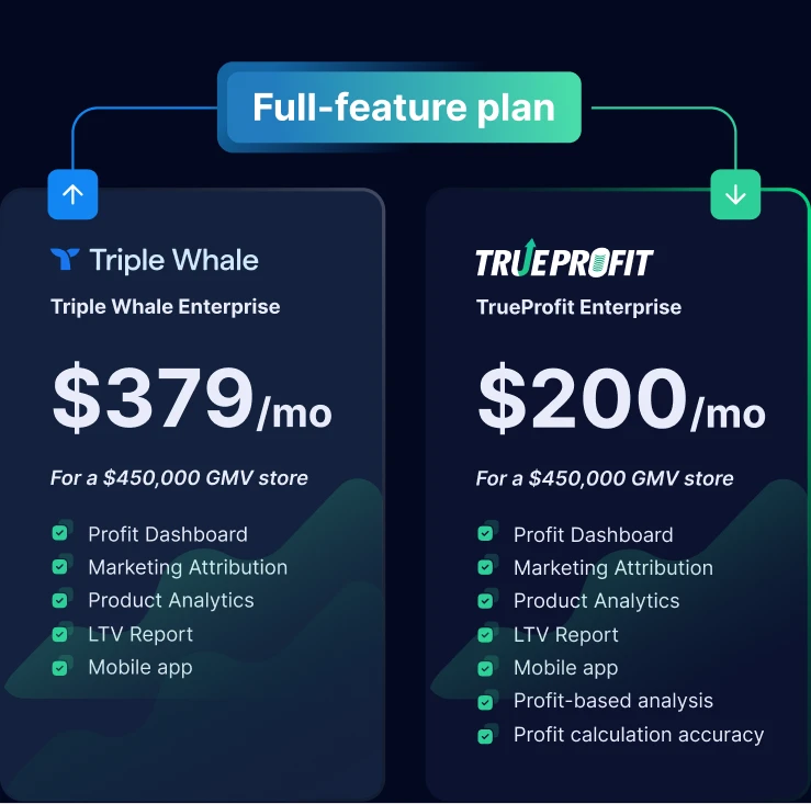 - Compare products: Unveil product-level profitability, available in TrueProfit $50 Advanced plan. Triple Whale costs $279.