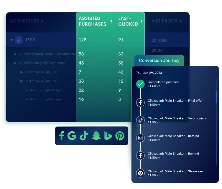 TrueProfit Marketing Attribution reports when an ad directly leads to a purchase (Last-clicked) but also when it contributes to any part of the journey prior to the conversion (Assisted).